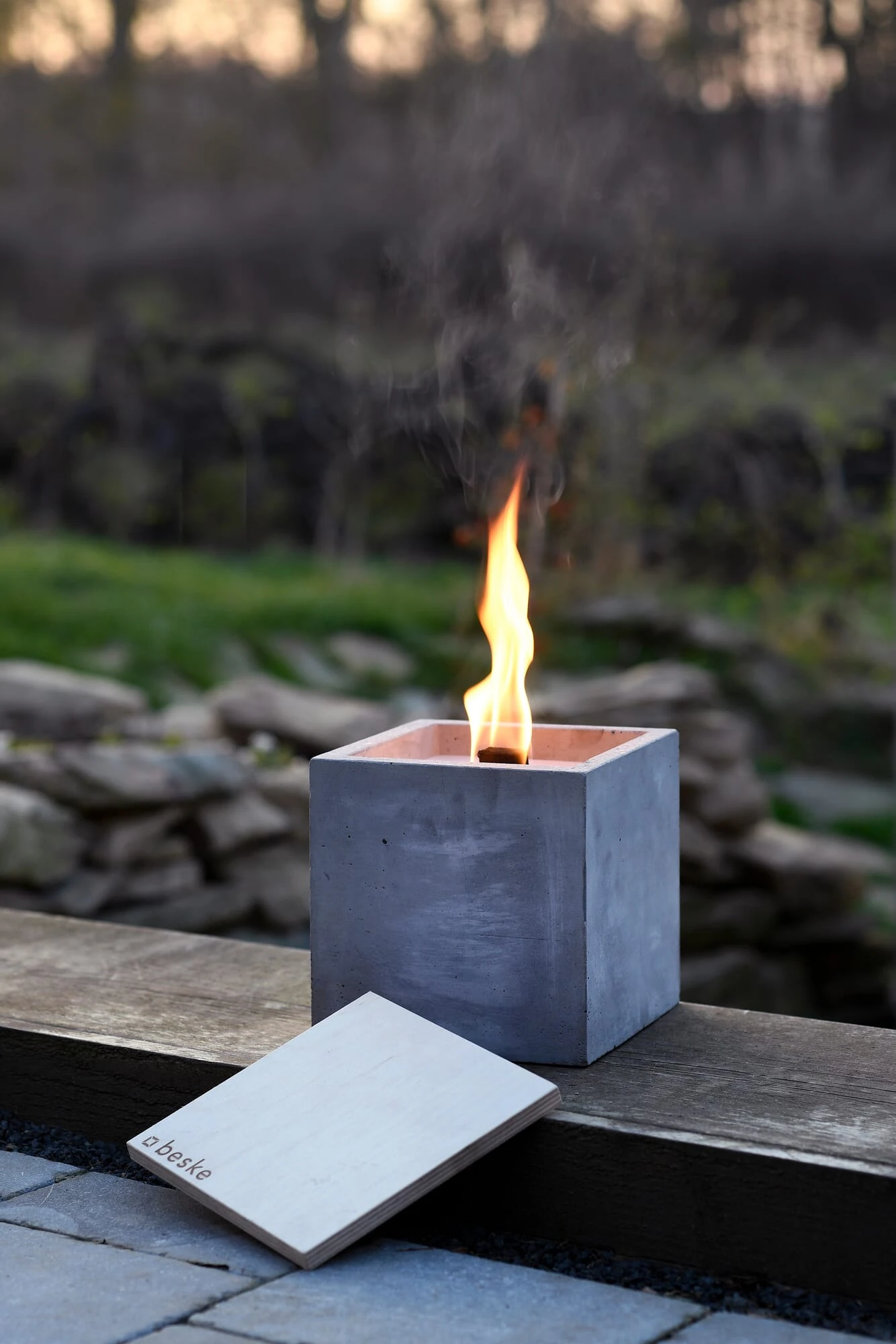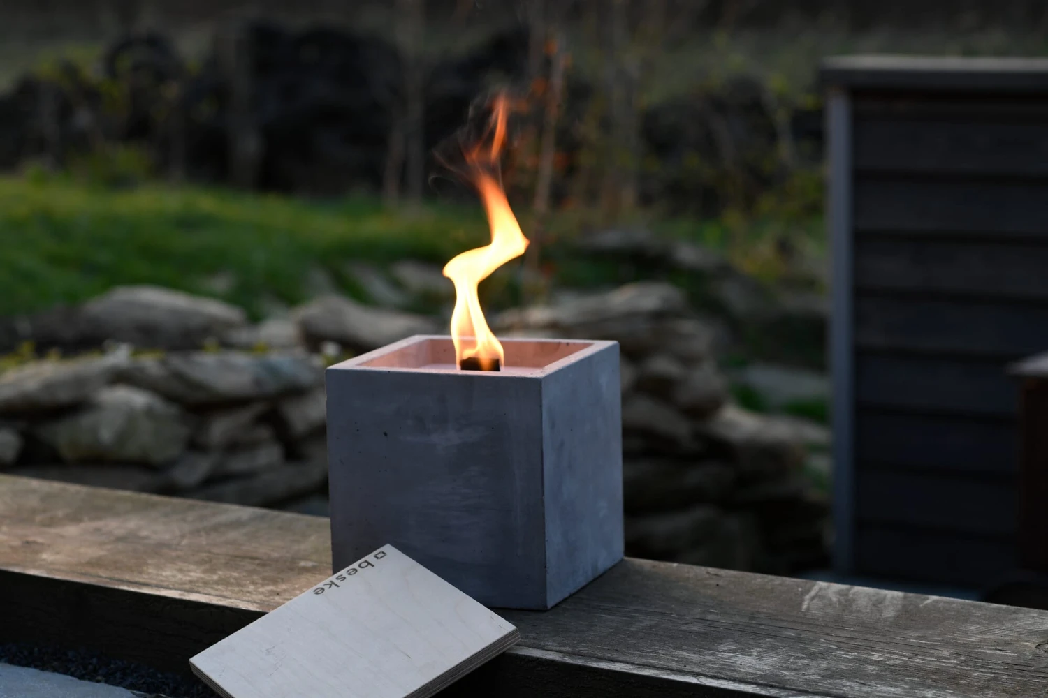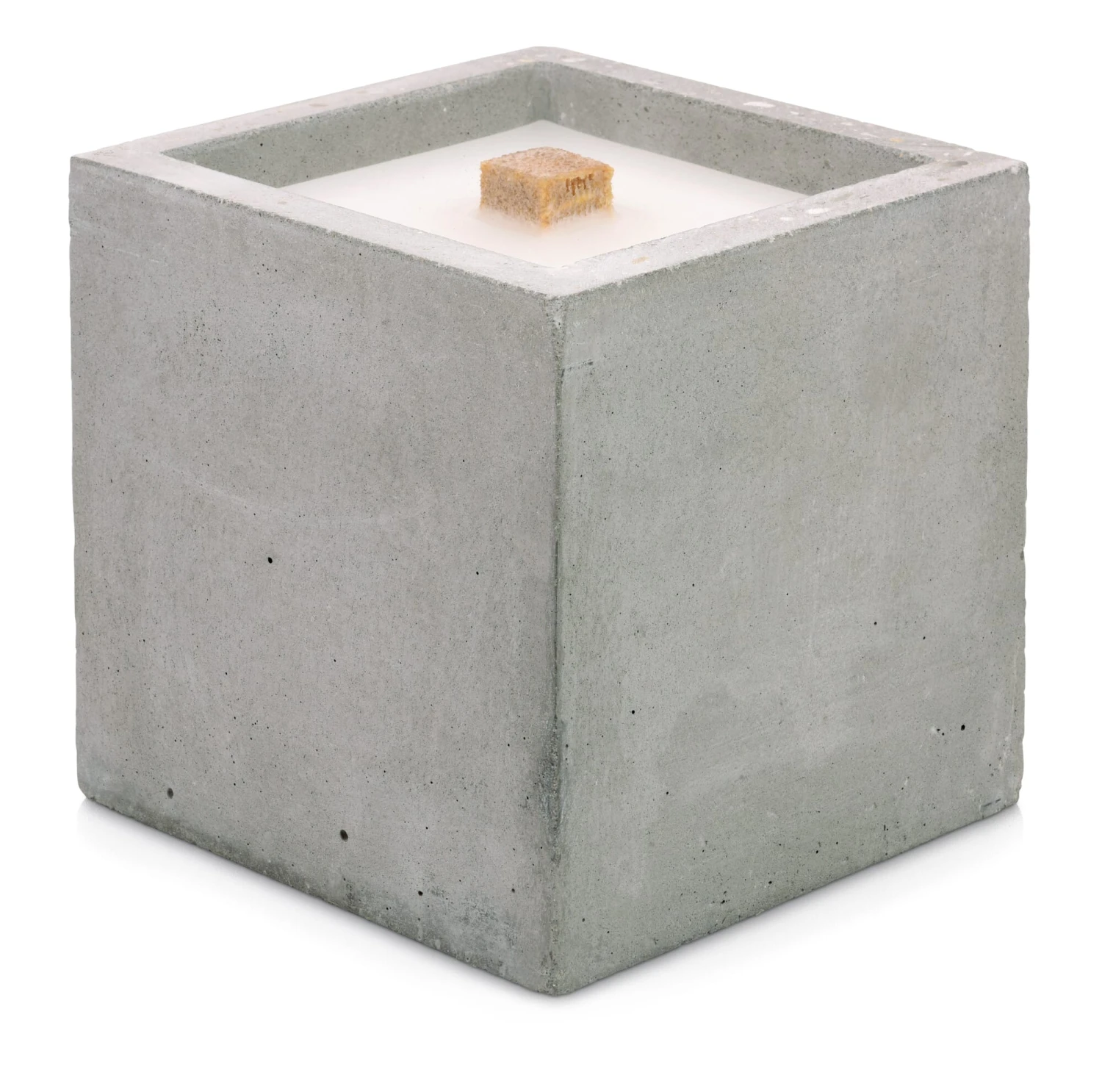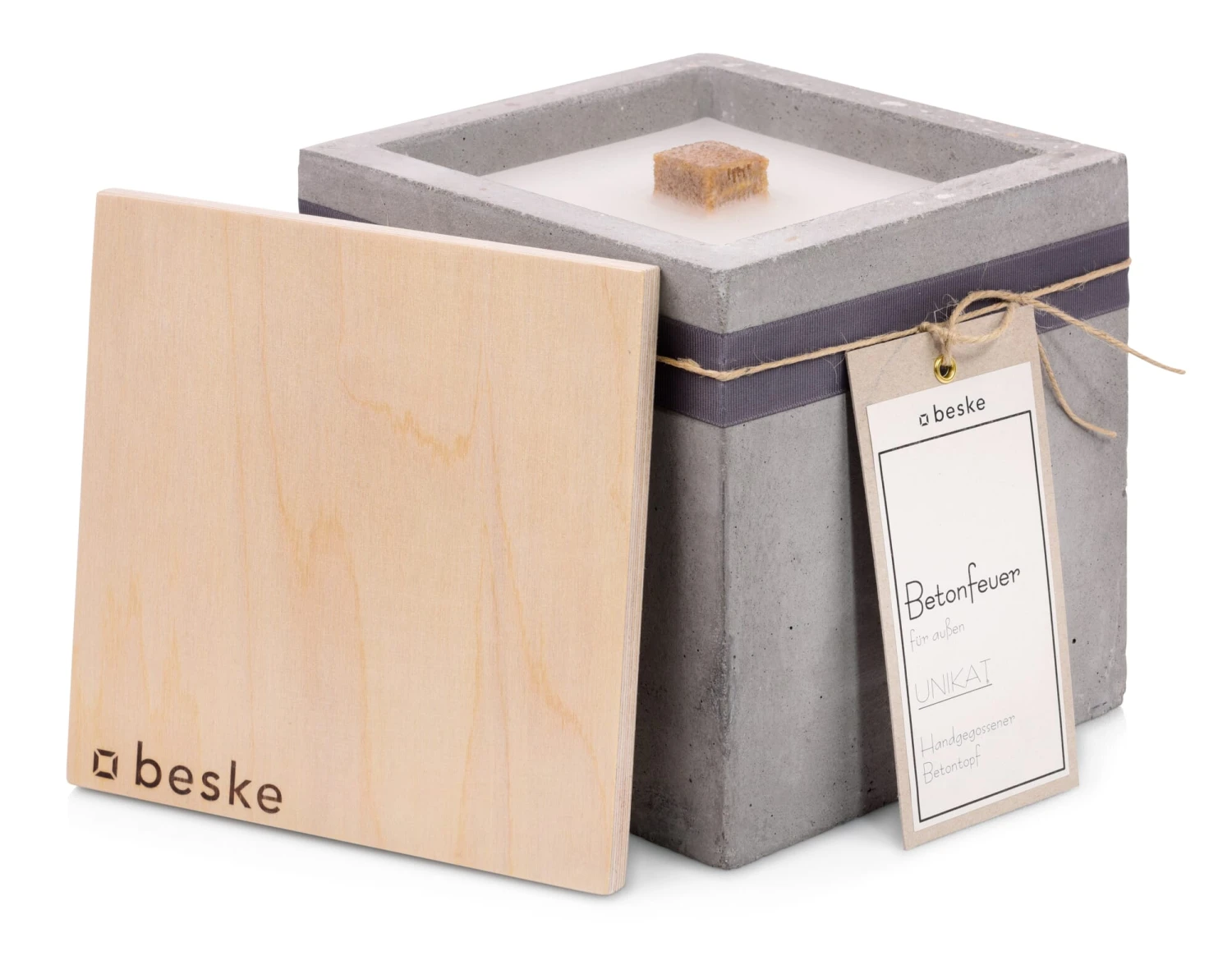 In de tuin en op het terras valt de betonnen vuurkubus op als sfeervolle lichtbron. De grote verbrandingskamer en de uitzonderlijk sterke lont van de schaal zorgen voor een hoge weerstand van de toortsachtige vlam, die zelfs onder slechte weersomstandigheden nog 10 tot 15 centimeter hoog oplaait. Als kleine bijzonderheid bieden wij voor de kubusvormige betonhaard apart een speciaal ontworpen stalen standaard aan, van waaruit hij zijn toortslicht wat verder werpt. De grote verbrandingskamer van de betonhaard kan gemakkelijk worden bijgevuld met uw eigen kaarsvetresten of met het apart aangeboden navulwas – als dit regelmatig gebeurt, zodat de lont niet te ver opbrandt, blijkt het een duurzame, functionele permanente brander voor jaren. De betonnen haard wordt ook geleverd met een blusdeksel van berkenhout, dat op drie manieren nuttig is: het smoort de vlam veilig en schoon, beschermt de lont en de was tegen vervuiling wanneer hij niet wordt gebruikt en snijdt ook een aantrekkelijk figuur als basis.