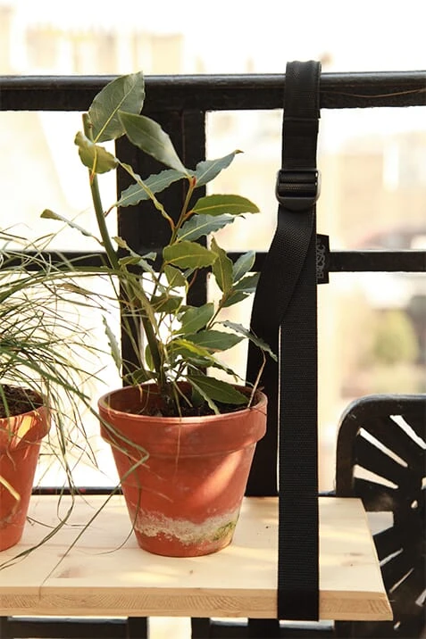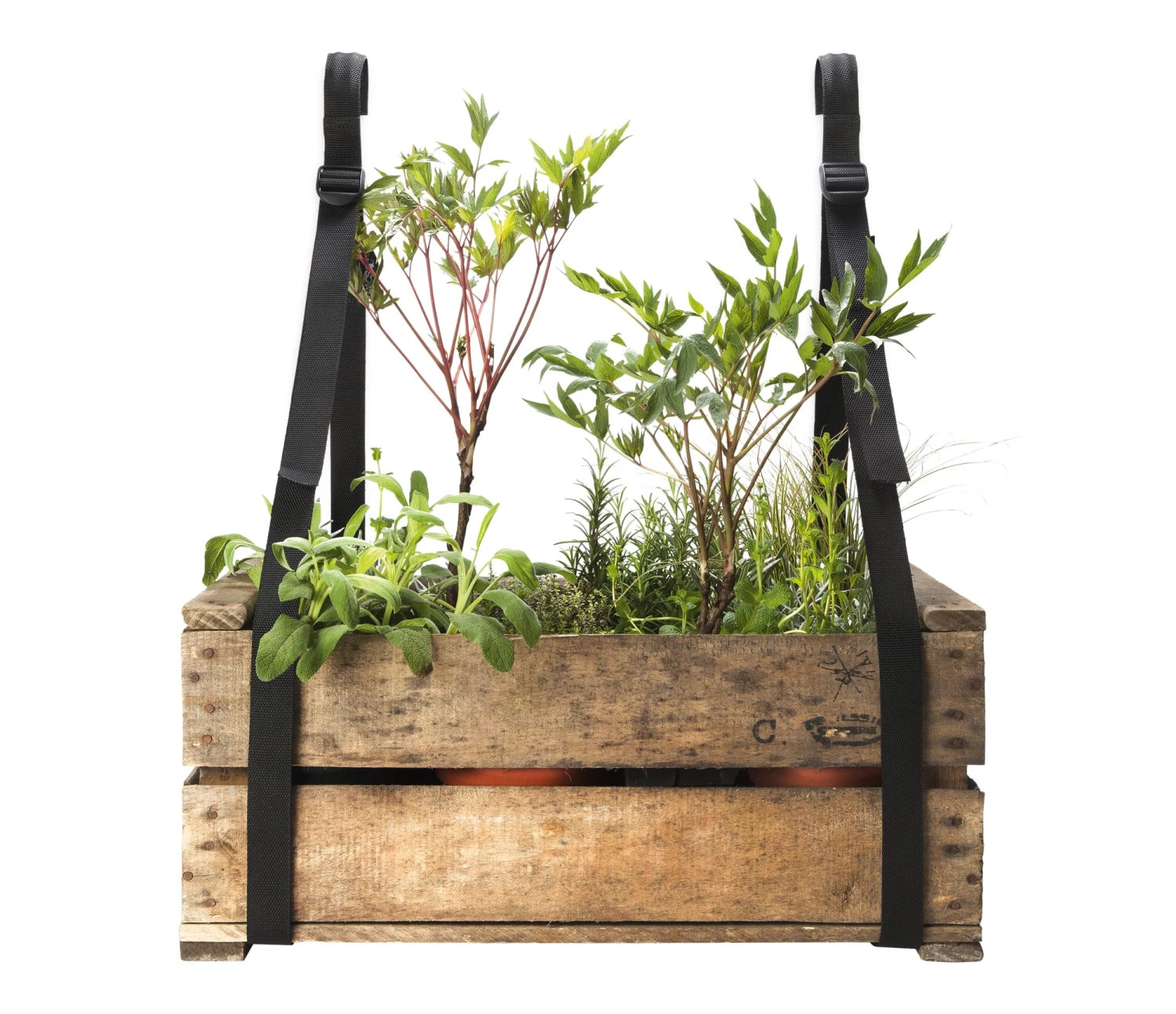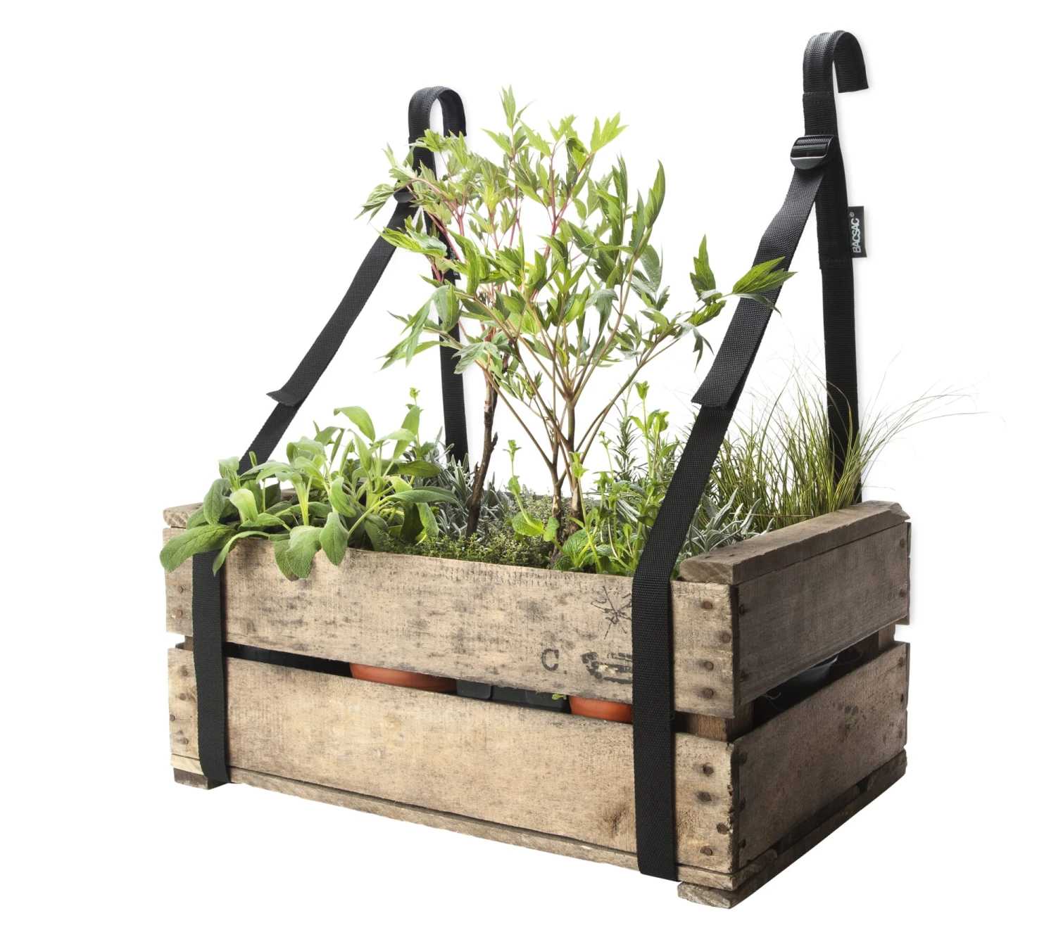 Breid uw balkon uit: met behulp van deze inhaakbanden kunnen dozen en planken van verschillende formaten aan balkonrails of soortgelijke voorzieningen worden bevestigd. De hier getoonde wijnkist is slechts één mogelijke toepassing. Ook plankjes, planken of andere bakken kunnen worden gebruikt.