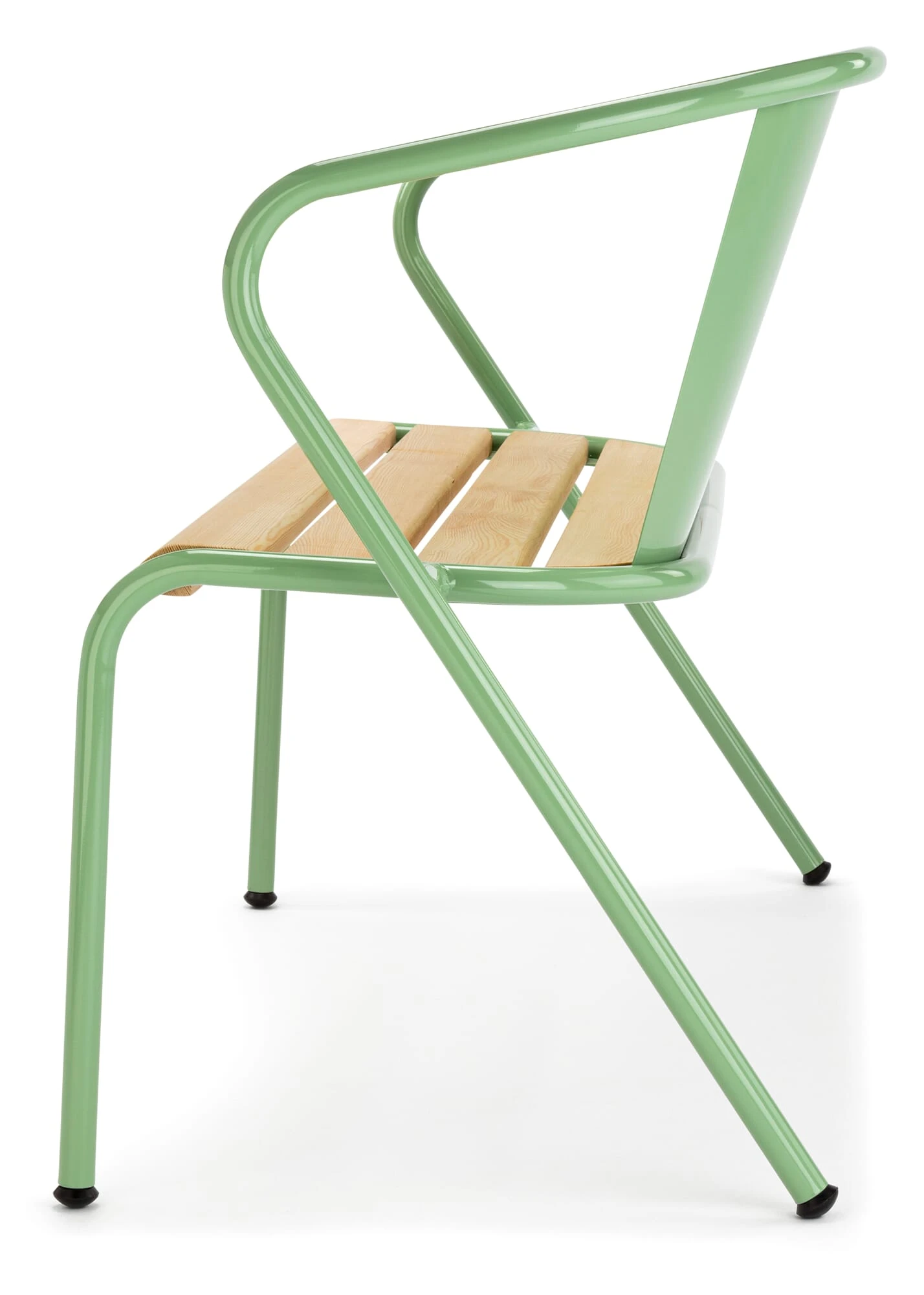Afmetingen: B 125 × D 59 × H 76 cm, zithoogte: 42,5 cm – stapelbaarGewicht: 14 kgMateriaal: staal, gepoedercoat; latten: lariks (herkomst: Portugal); poten: kunststof