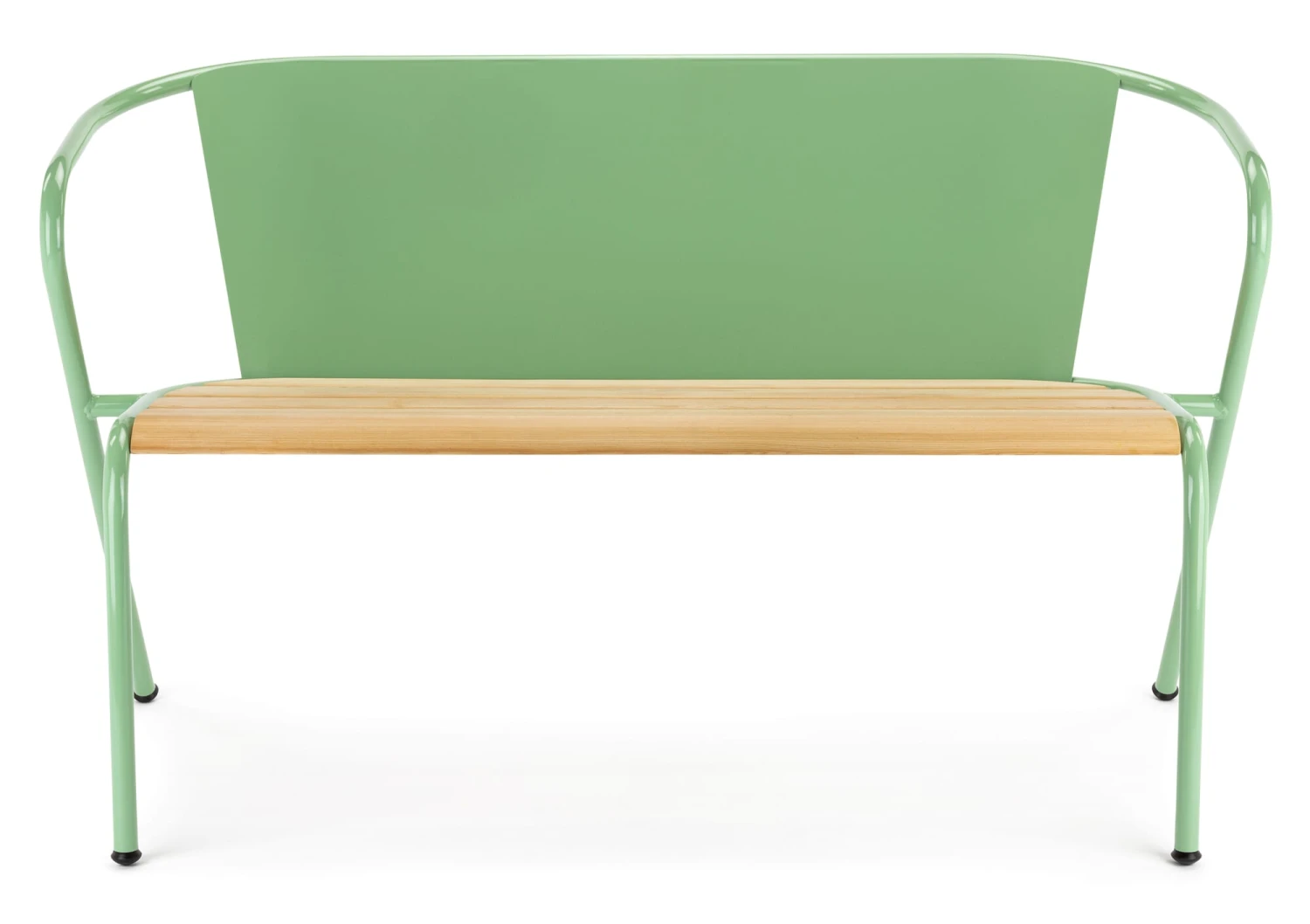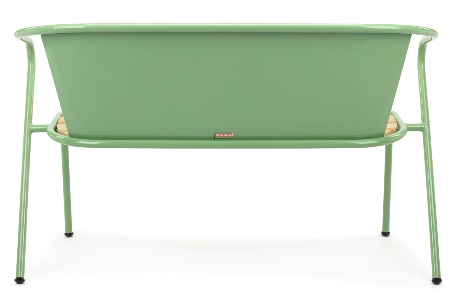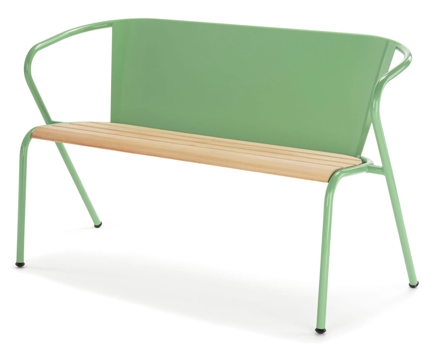 De bank voor de Portugese ESTORIL-stoel. Afgeleid van de vorm van de sinds de jaren 1950 geproduceerde stoel, gemaakt van staal, weerbestendig gepoedercoat – en hier in een speciale versie met een zitting van weerbestendig larikshout. Het hout is onbehandeld, heeft een ongewoon hoge weerstand tegen verwering, zelfs in deze vorm omdat het inheems is in Europa, en kan seizoensgebonden buiten worden gebruikt. Behandeling – bijvoorbeeld oliën – is niet nodig, maar wel mogelijk. Larikshout wordt na verloop van tijd grijs door UV-straling, waardoor de in het hout aanwezige lignine vrijkomt. Bij de behandeling met olie raden wij aan een geschikte olie met pigmentatie te gebruiken, omdat dit het grijs worden voorkomt of vermindert. De mooi gevormde tweezitsbank heeft de zitmaten van de stoel, heeft dus een hoge rugleuning en is stapelbaar.