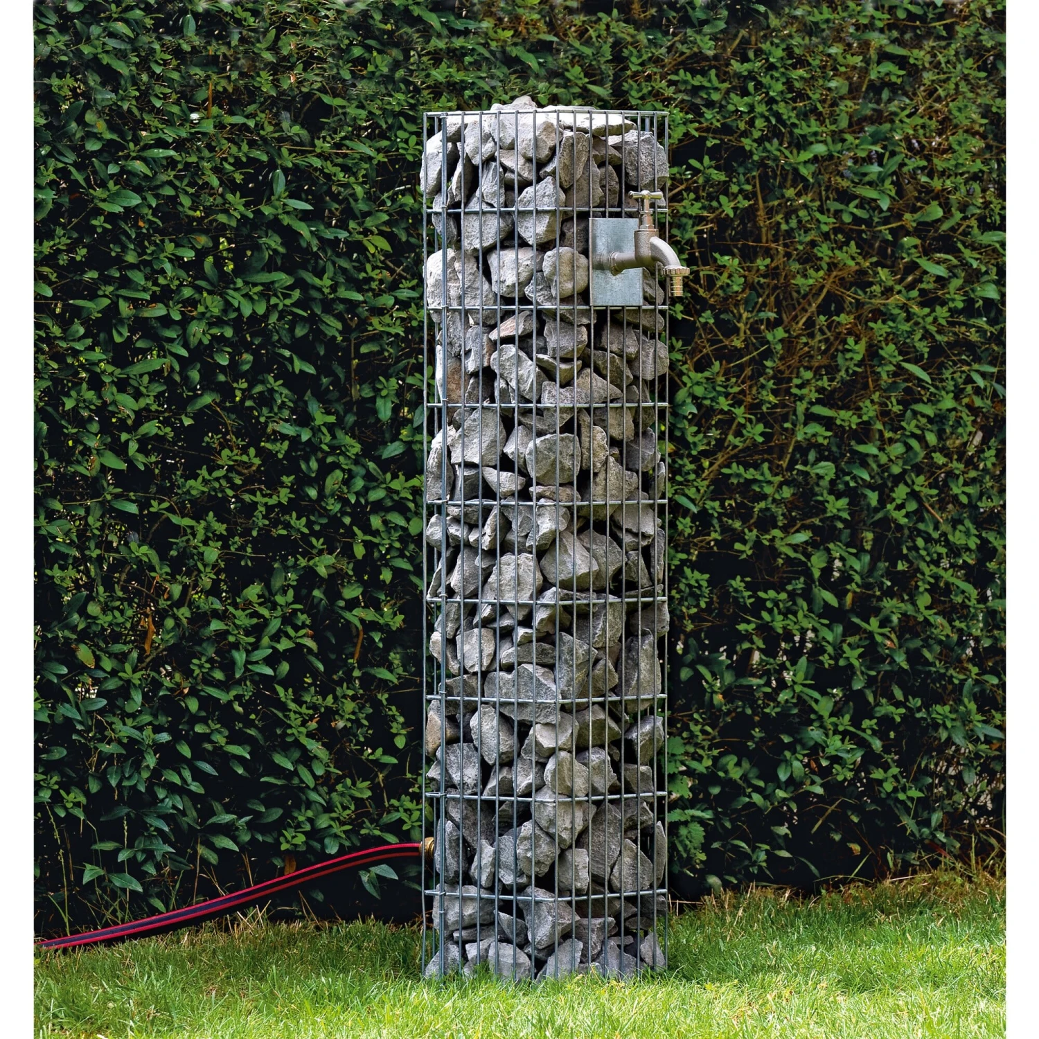 Gabion Staaldraad (staven Ø max. 4 mm) met zink-aluminium coating, thermisch verzinkte stalen bodemplaat en waterleiding, messing kraan met 3/4″ buitendraad en slangaansluitplug. Vier stalen grondankers meegeleverd. Hoogte 90,5 cm, schanskorf 19 x 19 cm, bodemplaat 28 x 28 cm. Gewicht 4,9 kg. Wij leveren de waterdispenser gemonteerd, maar zonder vulmateriaal en tuinslang. Er zijn geen grenzen aan de ontwerpmogelijkheden; wij raden natuurlijke stenen aan – eventueel in verschillende kleuren, in rijen gelegd – met een korrelgrootte van 25-60 mm, die u bij bouwmarkten kunt verkrijgen. Per kolom is ongeveer 50 kg stenen nodig.