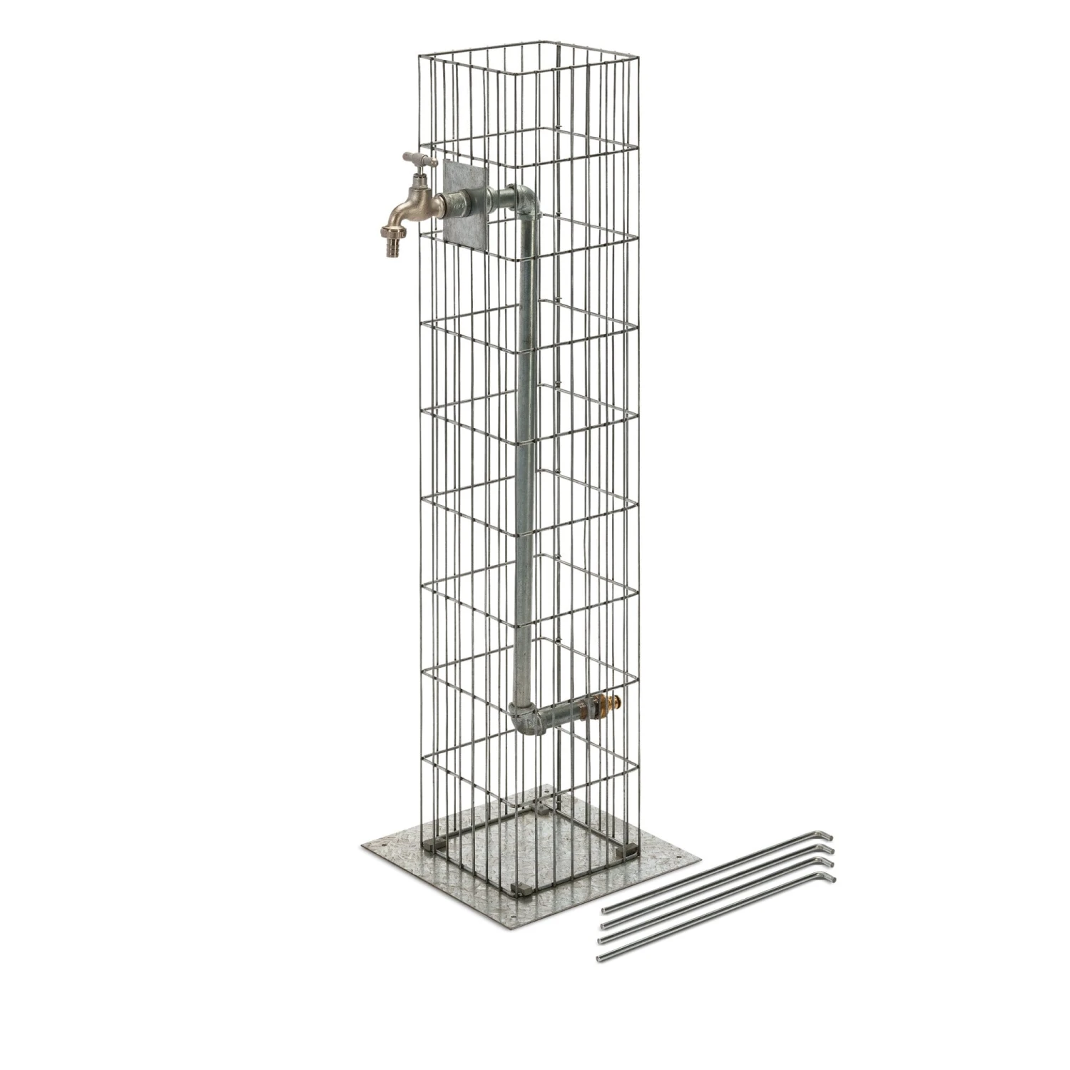 Deze slanke zuil is gemaakt van de duurzame roestwerende draad die gewoonlijk wordt gebruikt om schanskorven te maken. Het staat op een vierkante basisplaat van staal, die gemakkelijk te verankeren is: Wij leveren vier “haringen” voor bevestiging op losse grond; op vaste grond kunt u de bodemplaat gewoon vastschroeven. Een slang wordt aangesloten op de onderaan geïnstalleerde stop; de kraan voor het aftappen van water is zo geplaatst dat zelfs hoge vaten eronder kunnen worden geplaatst.
