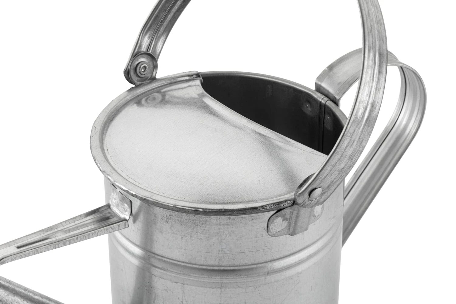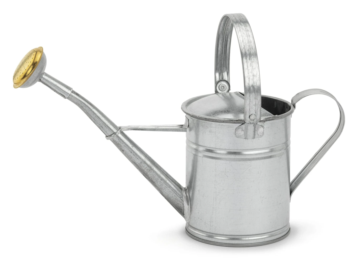 Zinkend plaatstaal. Afneembare messing douchekop met een omringende rubberen ring. Deel 2 l. Ø 13 cm. Hoogte 27 cm (zonder handvat 15,5 cm), lengte 40 cm. Gewicht 470 g.