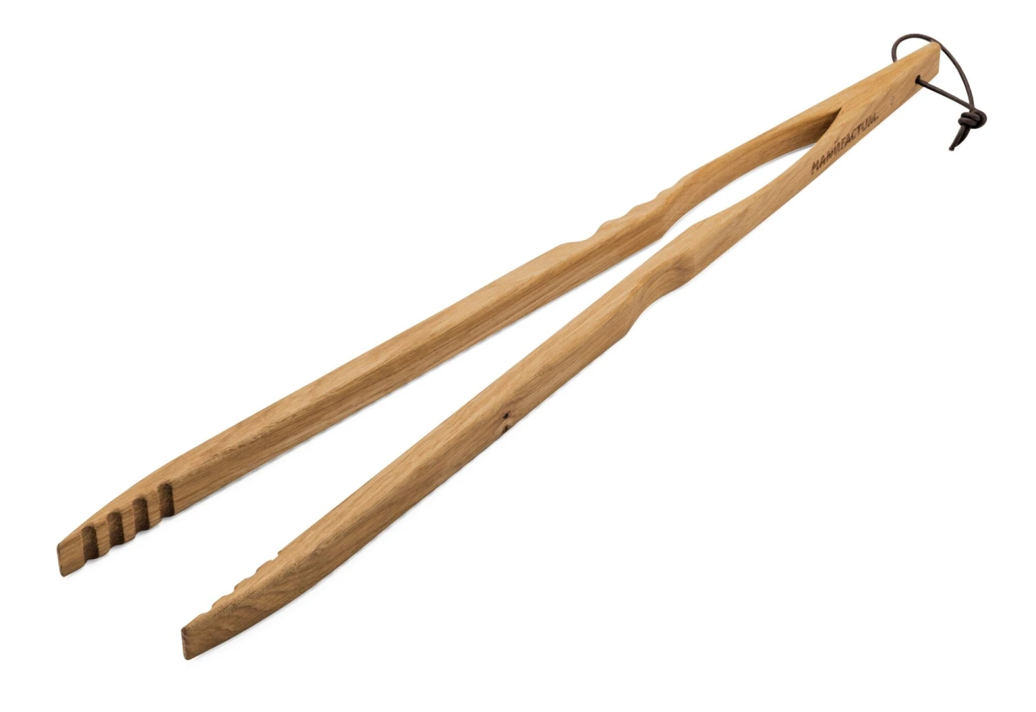 Alle worsten op de grill kunnen in één beweging worden omgedraaid. Inkepingen aan de onderkant van de twee grijpbekken maken het mogelijk door de lange tang dicht op het voedsel te drukken en eraan te duwen of te trekken. De gegrilde worstjes rollen heen en weer op de grill eronder. De fabrikant, Werkstätten Bethel in Bielefeld, gebruikt uitsluitend voor Manufactum gecertificeerd hout uit duurzame bosbouw in de omgeving van zijn bedrijf. In dit geval is het hout van Engelse eiken gedrenkt in bakolie. De houten oppervlakken zijn glad geschuurd, en verzonken handgrepen vergemakkelijken het hanteren.
