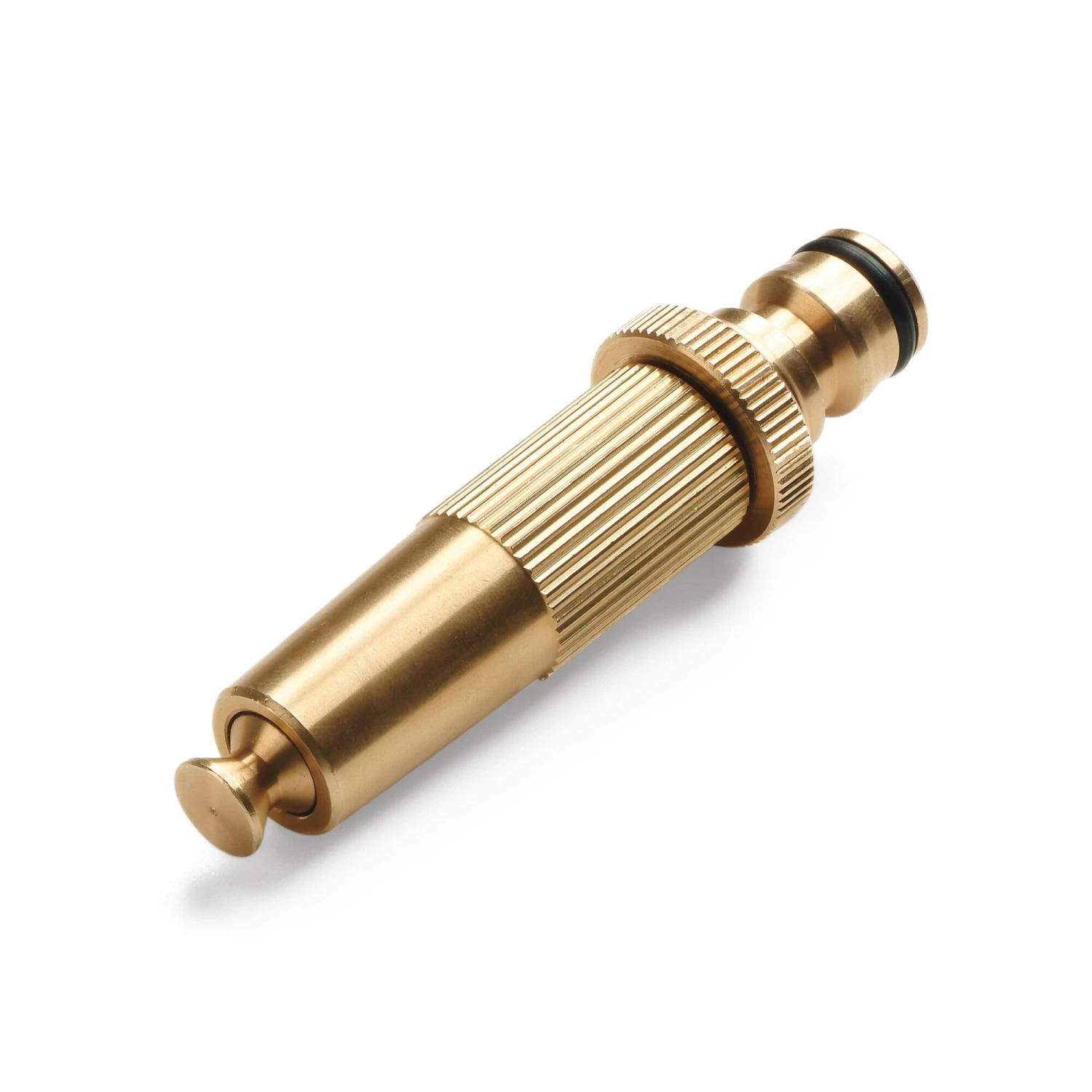 Met deze spuitkop van massief messing kan de sterkte van de waterstraal traploos worden ingesteld. Dit gebeurt door eenvoudigweg de sproeikop te draaien. Dit hulpstuk is klaar voor aansluiting met een messing plug die rechtstreeks kan worden aangesloten op een slang die voorzien is van een Rehau slangkoppeling (of een gewone plastic koppeling). Het is zinvol deze aan te sluiten op een slangkoppeling met waterstopfunctie.