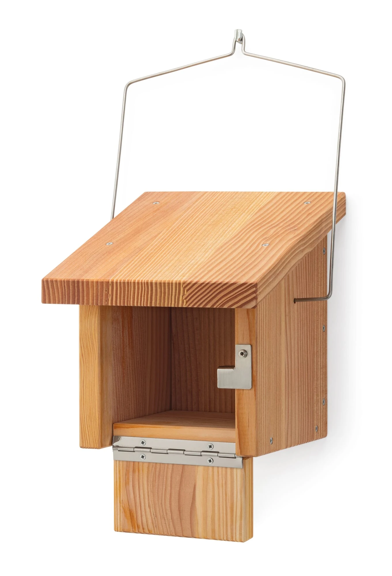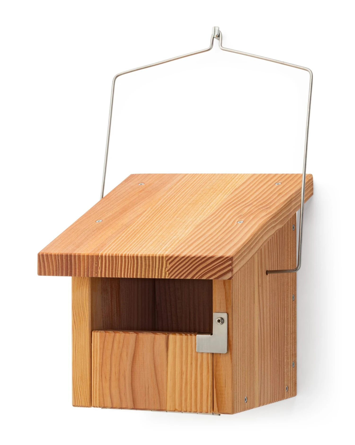 Deze vorm van nestkast wordt een halve grot genoemd. Niet helemaal gesloten zoals de klassieke nestkast met een kleine invliegopening (die de voorkeur heeft van holenbroeders zoals mees, boomklever, mus en spreeuw), maar toch minder open dan een vrij in het landschap of in een boom gebouwd nest (dat merels of vinken bijvoorbeeld graag bezetten). Een halve grot, gemaakt van inheems larikshout en met zijn relatief grote opening die veel licht binnenlaat in de nestruimte, is hij volledig aangepast aan de behoeften van nestelende nichevogels zoals waterspreeuwen, kwikstaarten, roodborstjes of roodstaarten. De speciale functie: Voor het schoonmaken kan de voorwand volledig worden ingeklapt en vervolgens met een speciaal beslag weer veilig worden afgesloten. Dit nestkastje is alleen verkrijgbaar bij Manufactum.