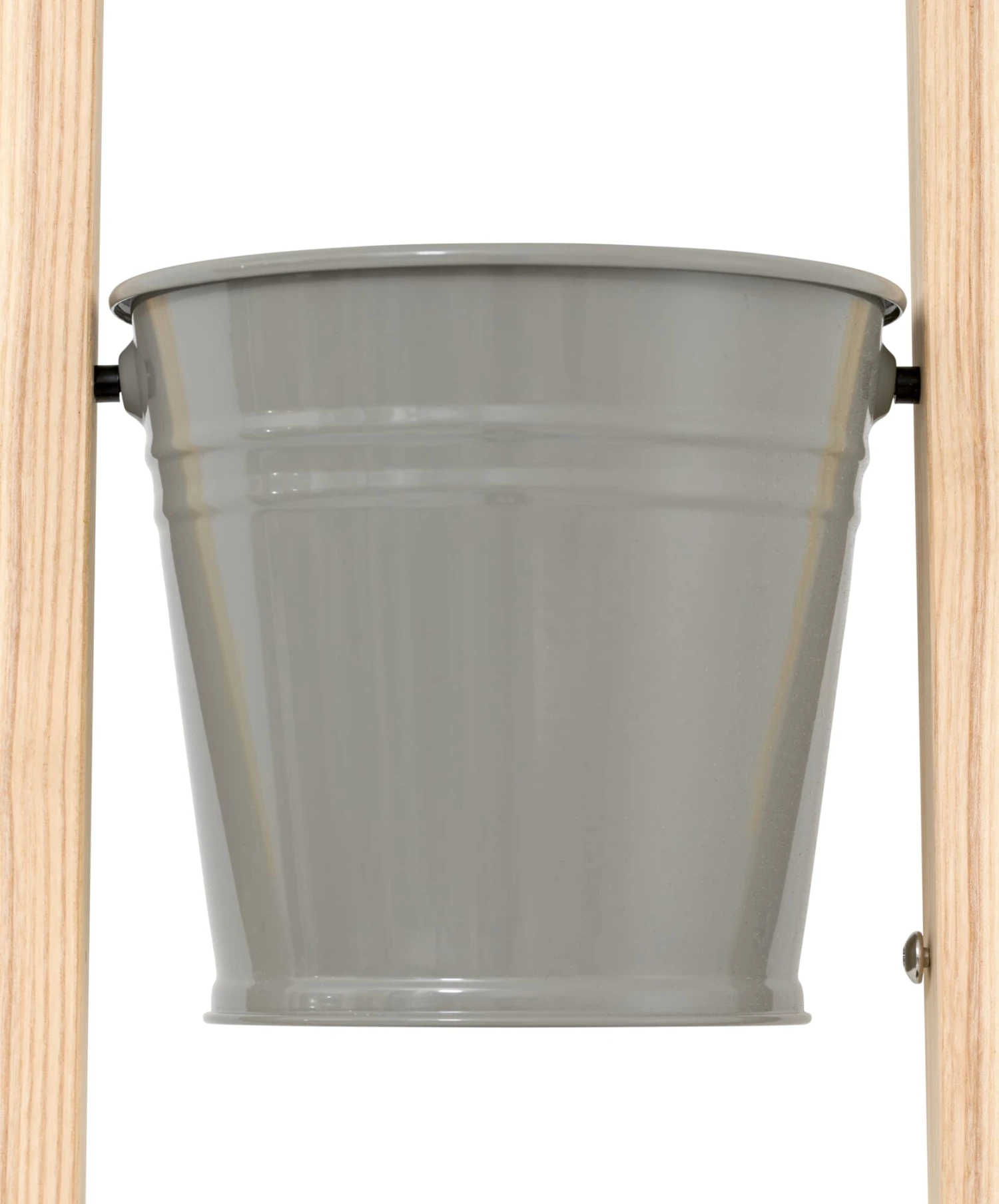 Waar ruimte ontbreekt, zijn verticale systemen de perfecte oplossing. Met een plantentrap kunt u de hoogte van uw balkon en terras veroveren. Zowel buiten als binnen, leunend tegen de muur in volle lengte of opgesteld als een aantrekkelijke, groene ruimteverdeler in huis: U kunt uw planten ruimtebesparend en groeivriendelijk over zes etages verdelen. Dankzij de verspringende plaatsing van de eenvoudige plantenbakken van gelakt plaatstaal krijgt elke plant voldoende licht en lucht om tot volle bloei te komen. De plantenbakken, die aan de onderkant gesloten zijn, worden in het stevige, stabiele ladderframe van essenhout gehangen en op twee plaatsen vastgezet. Met een beetje zorg kan overtollig water of regenwater gemakkelijk worden afgevoerd (kantel de potten iets naar voren; u kunt uw planten het beste van tevoren uit de plantenbakken halen). U kunt de plantenbakken ook rechtstreeks beplanten. Hoe dan ook – als het harder regent, let er dan op dat er niet te veel water in de potten komt en de planten te nat in hun bak staan. Matig water geven is altijd een voordeel. Om de vloer te beschermen en uitglijden te voorkomen, wordt elke plantladder geleverd met op maat gesneden viltglijders. Uitgevouwen biedt een roestvrijstalen clip in het midden extra steun.