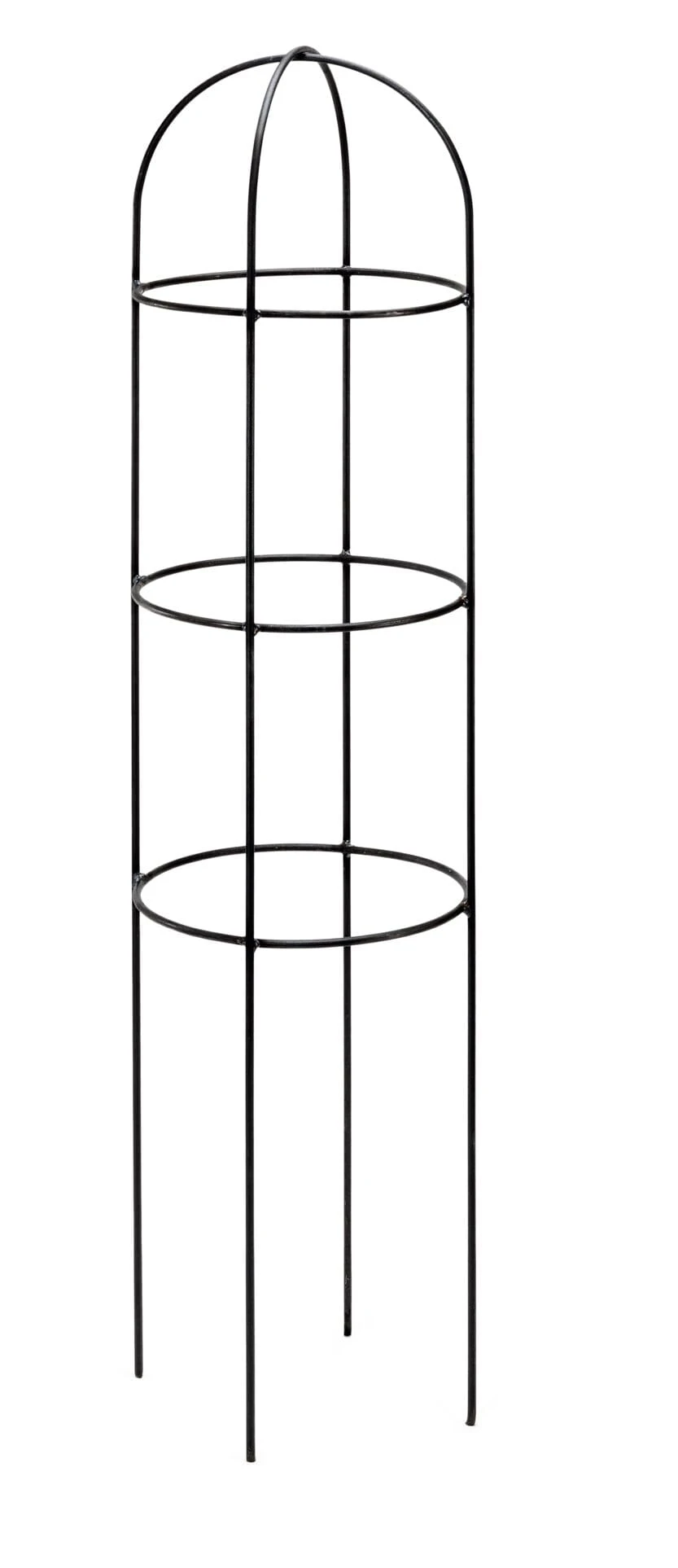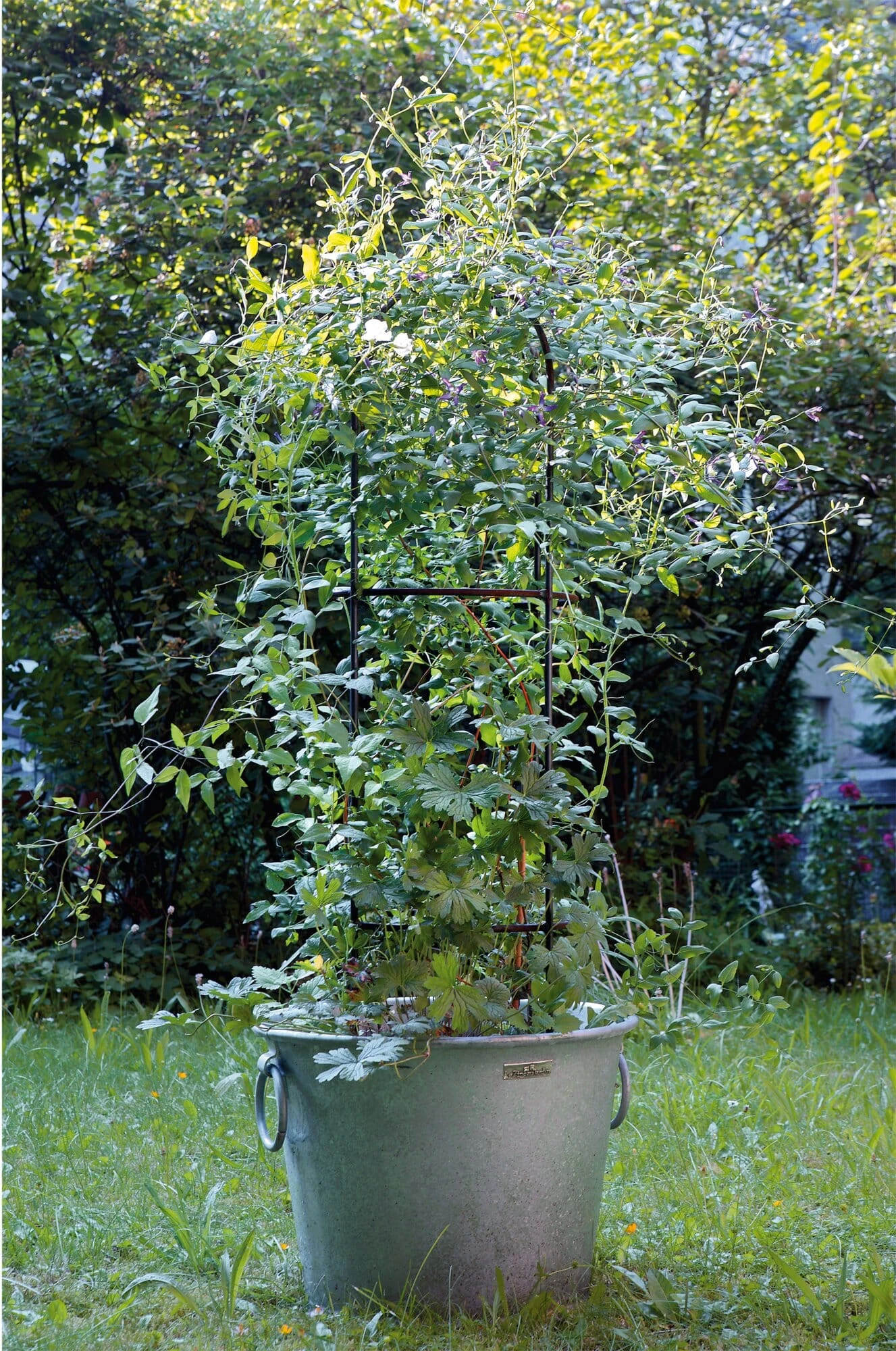 Deze stalen obelisk kan worden gebruikt om kleine klimrozen, bosranken of eenjarige klimplanten in potten tot een kleine sculptuur te verheffen. Maar het kan ook worden gebruikt in het bloembed om zelfdragende groenten stevig te ondersteunen.