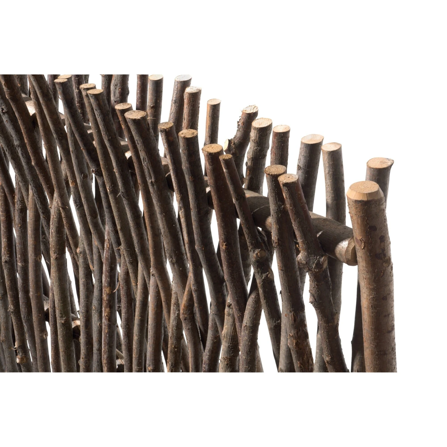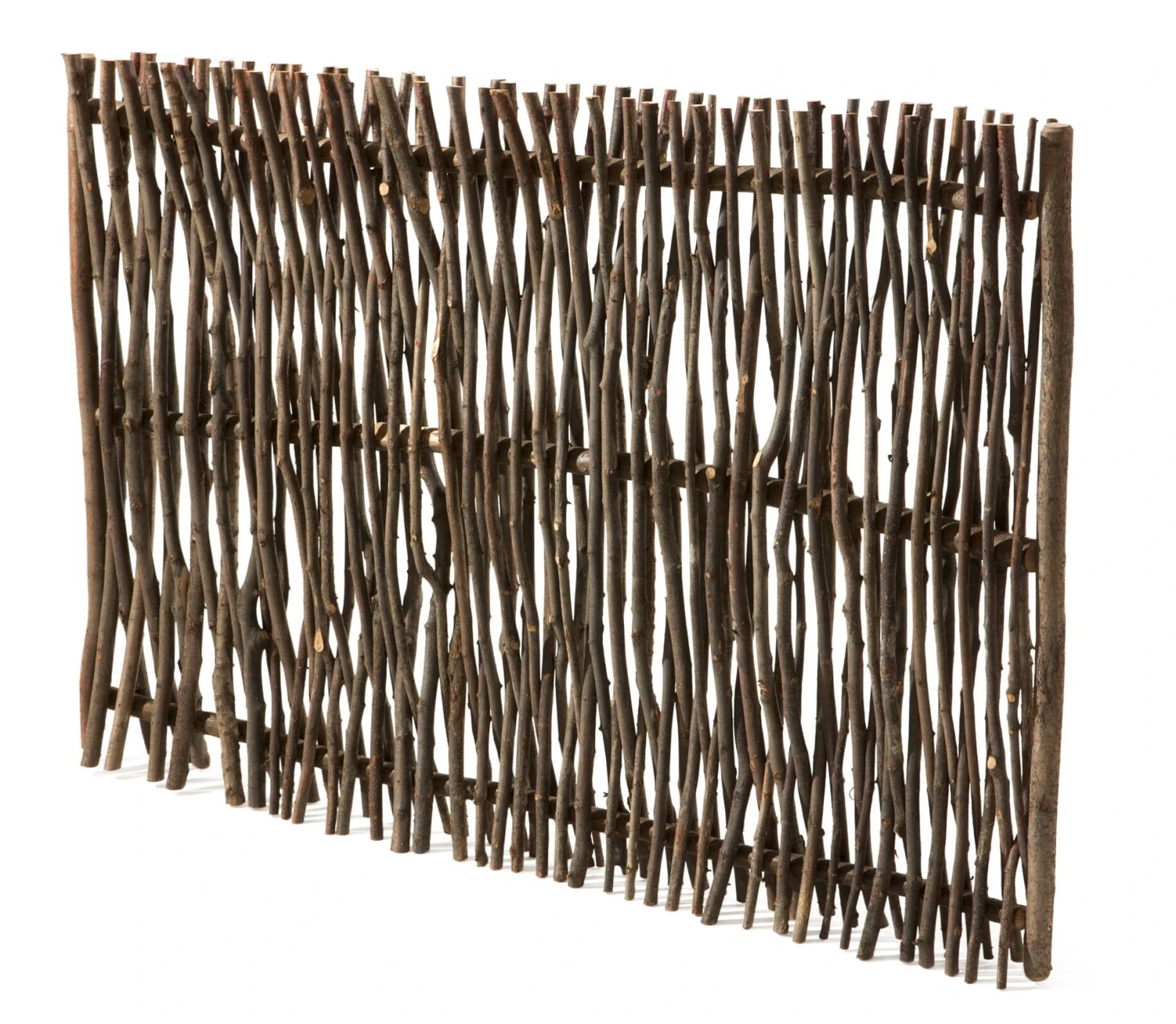 Gemaakt van hazelaarstaven. Hoogte 1,8 m, breedte 1,5 m, diepte 12 cm. Gewicht 28 kg.
