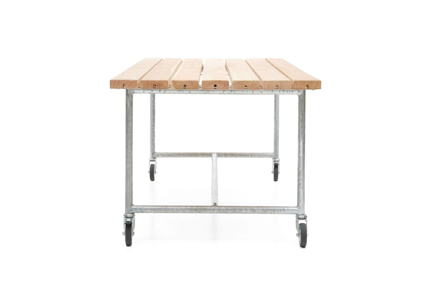 Afmetingen: B 177 × D 87 × H 74 cmWeight: 85,5 kgMaterial: Frame: Staal, thermisch verzinkt; planken: lariks, onbehandeld FSC® (herkomst: Letland); wielen: Staal, gegalvaniseerd, met rubber bekleed
