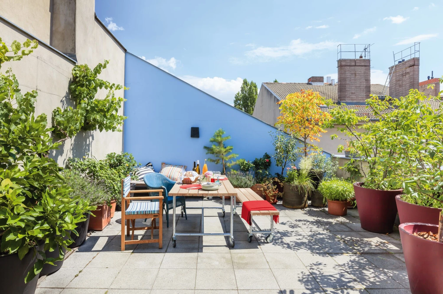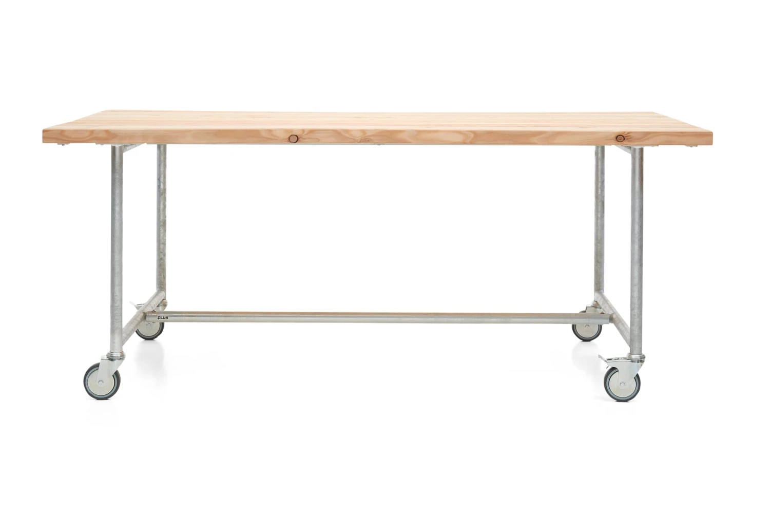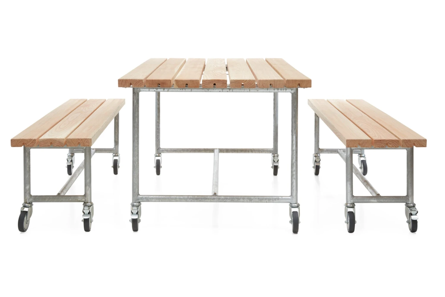 Robuust en uiterst duurzaam: JÜTLAND laat op het eerste gezicht zien waartoe het in staat is met zijn industriële constructie. Het thermisch verzinkte stalen frame en de planken van onder druk geïmpregneerd massief hout trotseren het weer. De tafel en de bijbehorende bank zijn gemakkelijk te verplaatsen op het erf en in de tuin op hun gedeeltelijk vergrendelbare wielen. De meubelen worden gedemonteerd geleverd – het stalen frame en de planken moeten afzonderlijk worden gemonteerd.