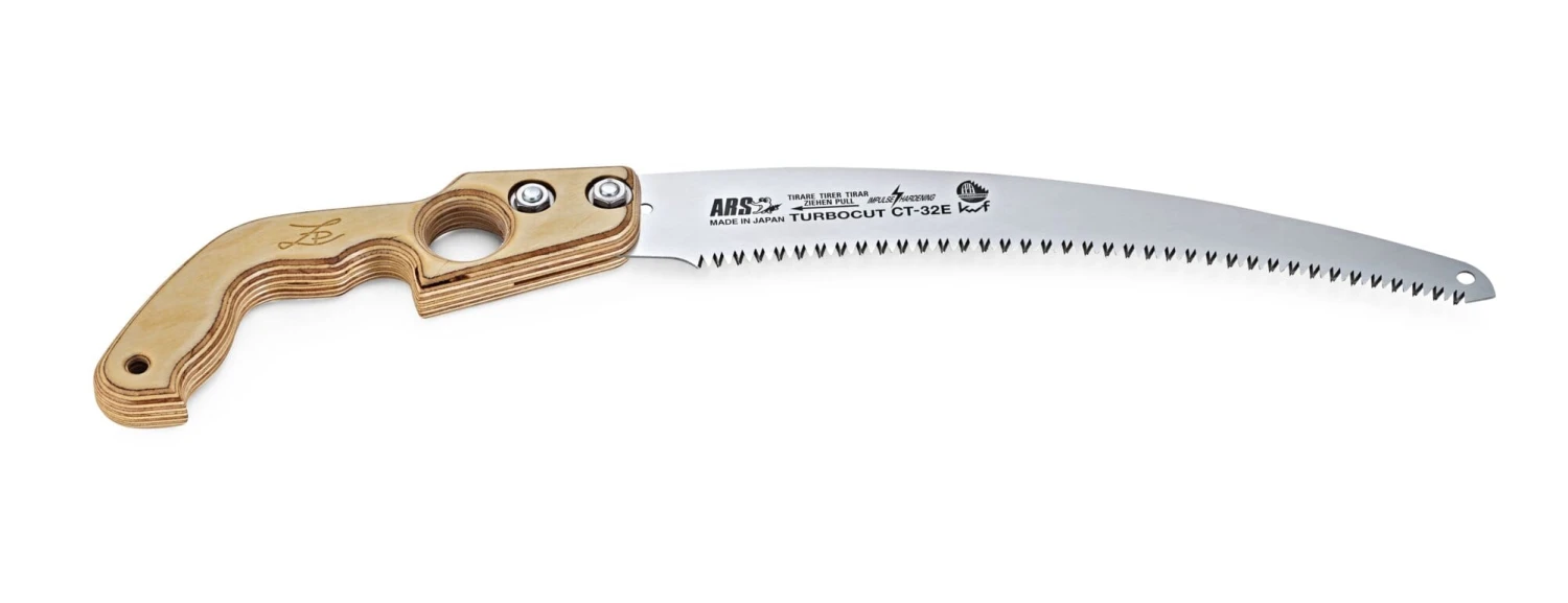 Zaagblad van koolstofstaal, hardverchroomd. Handvat van berkenmultiplex, geolied. Gemaakt in Japan. Klinglengte 33 cm, totale lengte 54 cm. Gewicht 280 g.